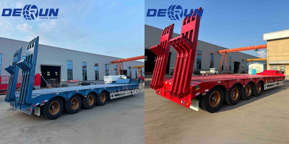 O semi-trailer exportado de quatro eixos de quatro eixos, com uma altura da plataforma de carga de apenas 0,9 metros, capaz de transportar carga de 80 toneladas ou ainda mais. O chassi é feito de aço manganês de 700 MPa de alta resistência através de estampagem de uma peça. Está equipado com eixos de 13 toneladas BPW, freios a disco de estilo alemão e abdominais e pneus de lama. que atende aos padrões de transporte de mineração da República Democrática do Congo.
