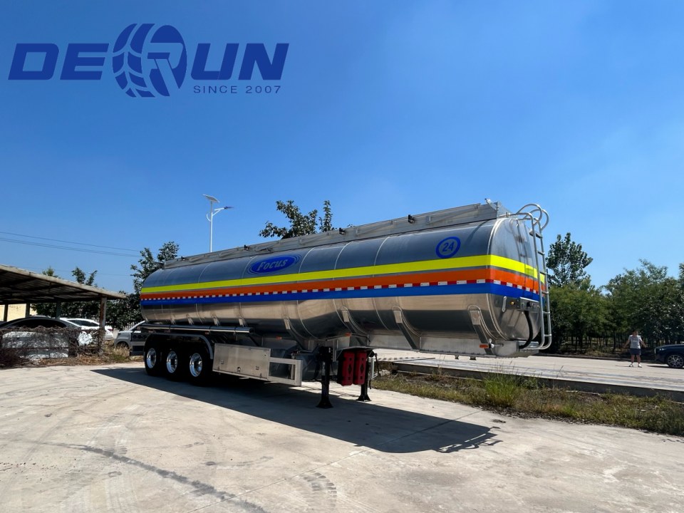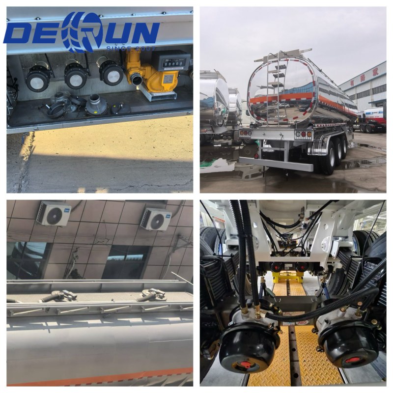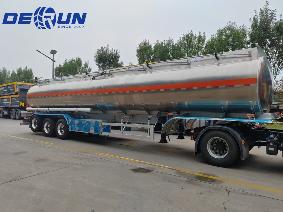 O trailer de tanque de óleo de liga de alumínio de três eixos Derun apresenta um corpo de tanque feito de liga de alumínio, oferecendo construção leve e resistência à corrosão. As placas e compartimentos anti-slosh internos suprimem efetivamente o movimento líquido, aumentando a estabilidade durante o transporte. A parte superior está equipada com uma tampa de bueiro e uma interface de recuperação de vapor, enquanto o fundo possui uma válvula de freio de emergência pneumática, tudo em conformidade com os regulamentos de carregamento e descarregamento argentino. Um revestimento refletivo branco reduz o aumento da temperatura da luz solar, minimizando as perdas de evaporação de combustível. A cauda do tanque inclui uma interface reservada para sensores de nível líquido, facilitando a instalação futura de sistemas de monitoramento inteligentes pelos clientes.